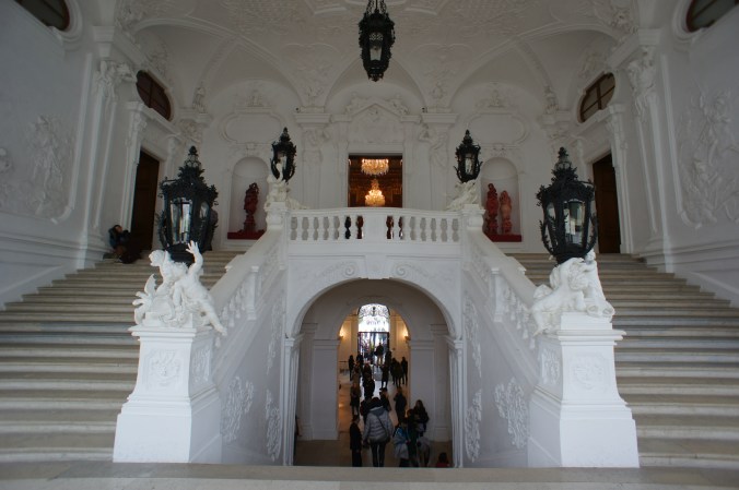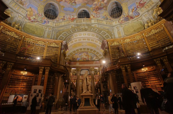 … wohingegen das Sissimuseum mehr verspricht als es bieten kann. Die privaten Räume des Kaisers und der Kaiserin sowie nachgestellte Kleider und ihr persönlicher Kultur- und Schminkkoffer sind nicht unbedingt eine Besichtigung wert. Den Prunksaal der Nationalbibiothek hingegen kann man sich gerne ansehen. Er hat uns so sehr beeindruckt, dass wir ihm hier gleich mehrere Bilder widmen.