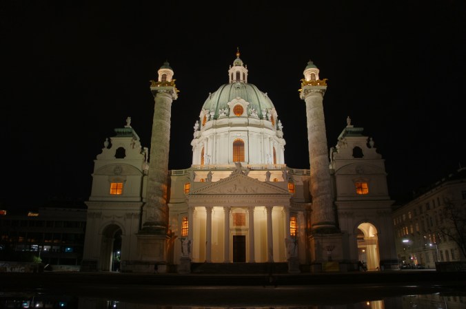 Zum Abschluss noch einen letzten Blick auf die Karlskirche bei Nacht.
