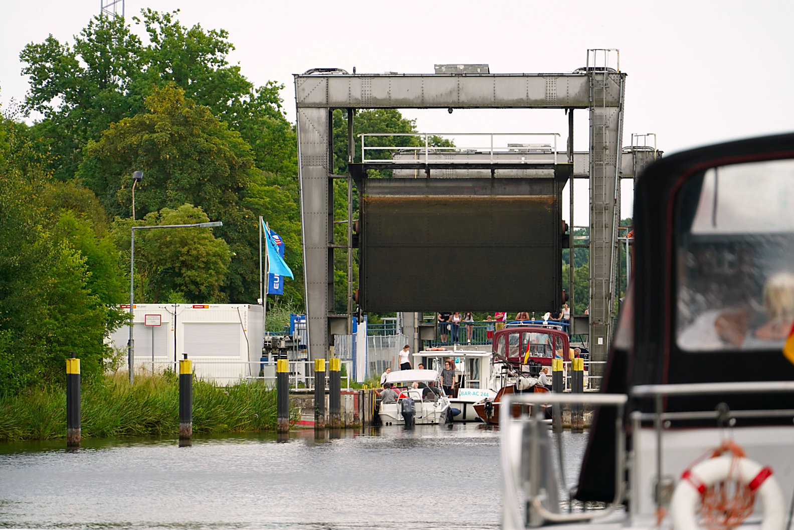 Aufregend und beeindruckend war der allererste Schleusendurchgang den wir gemeinsam meistern mussten. Wir hatten viele Geschichten über missglückte Schleusenvorgänge und schief liegende oder besser gesagt in der Luft hängende Schiffe gehört. Erst einmal erlebt können wir sagen, dass das gar keine schwierige Sache ist, die man auch zu zweit gut meistern kann. Im Inneren einer Schleuse zu sein und Verantwortung für ein Hausboot zu haben hat uns trotzdem beeindruckt und bleibt in Erinnerung. Ein erhebliches Aufkommen erwartet einen an der Schleuse von Mirow. Hier sollte man geduldig und manövrierfähig sein.