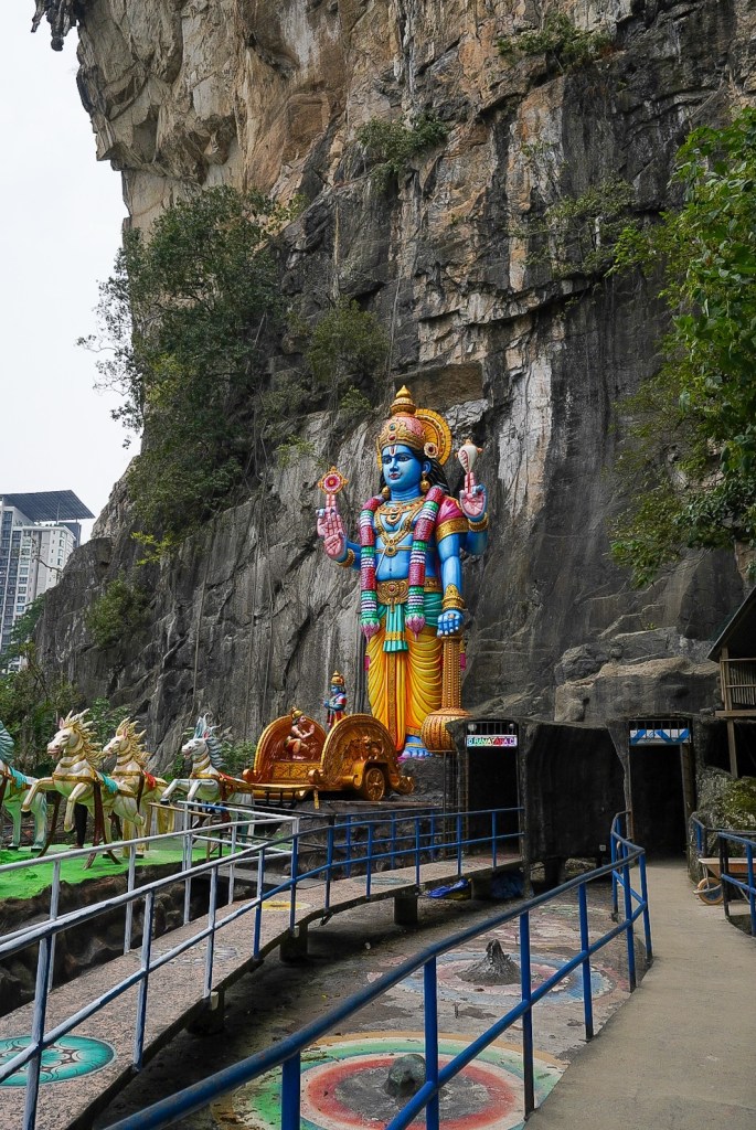 … Nämlich bei der darauffolgenden Besichtigung der Batu Caves, die von der hinduistischen Gottheit Murugan bewacht werden und von der wir entgegen unsere Annahme tatsächlich gar kein Foto gemacht haben. Die Batu Caves sind Tropfsteinhöhlen, hinduistischer Pilgerort und malaiisches Nationalheiligtum. Wir haben lange überlegt, ob wir über die bisher vielleicht größte Panne dieser Reise berichten und haben uns dafür entschieden. Immerhin haben wir es dieses Jahr zu zweit in den Flieger geschafft. Wir sind also mit der Bahn zum Tempel, die Station raus und wurden sofort von Menschen, die wirkten als würden sie für die Anlage arbeiten, eindringlich und wiederholt nach links geleitet. Dem sind wir brav gefolgt und da war dann auch schon die Höhle mit einer riesigen Statue davor.