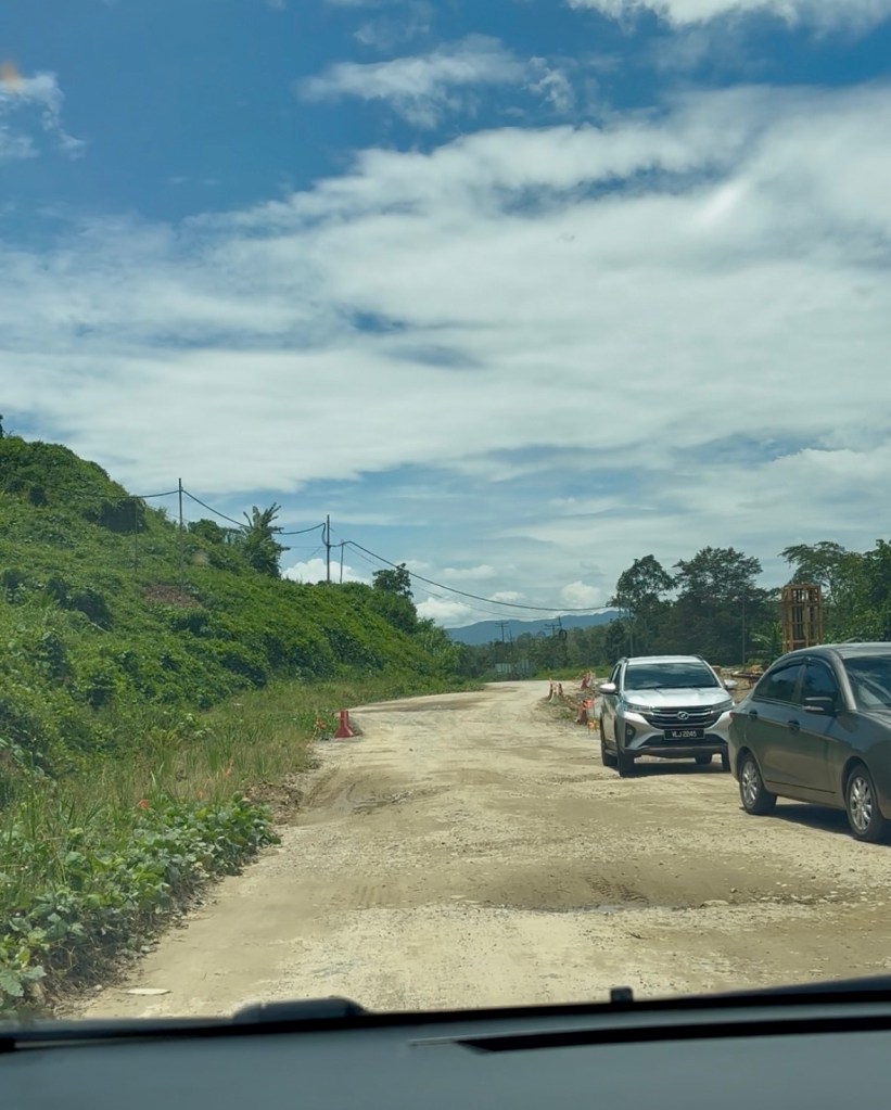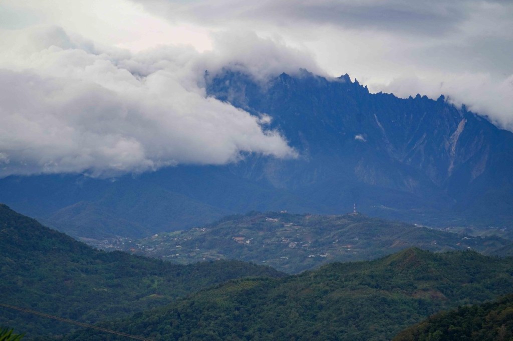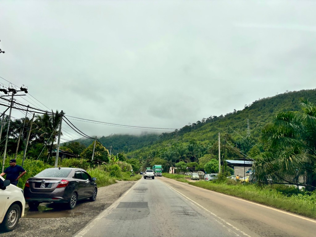Wir sind bereits 10 Stunden unterwegs gewesen, hatten Stau an der Grenze, Probleme bei der Einreise und schwierige Bedingungen auf der Straße. Nach Sabah fährt man durch das Gebirge, vorbei am höchsten Berg Borneos und Malaysias, dem Mount Kinabalu. Ein fantastischer Ausblick.
