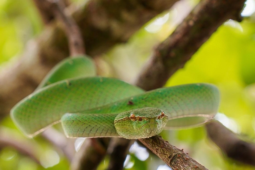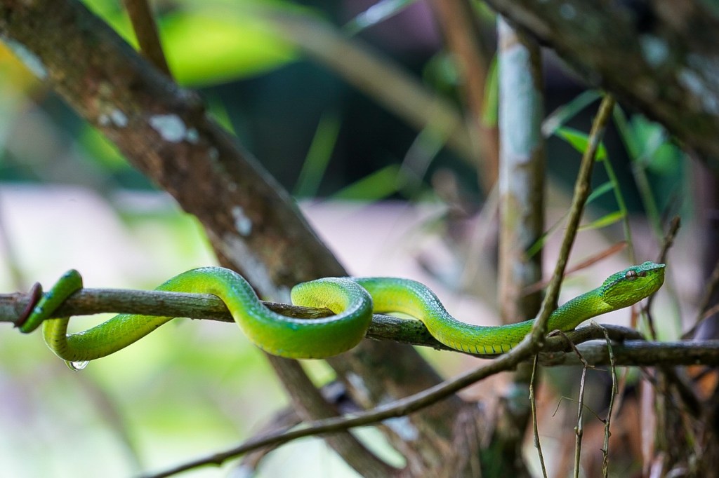 Die grüne Bambusotter ist giftig und ein Biss lebensbedrohlich