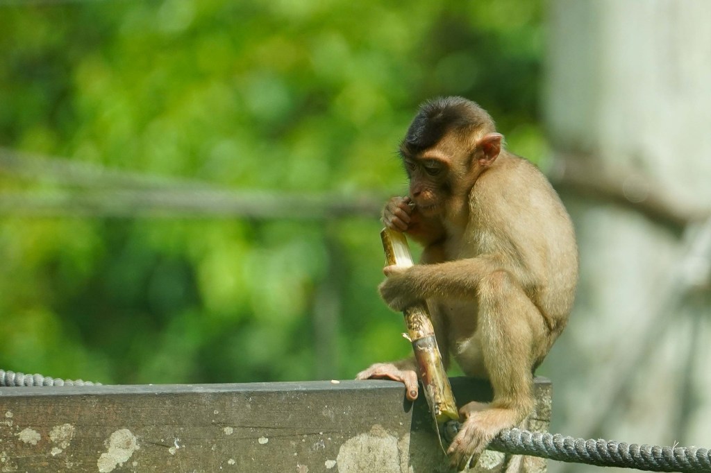 Sie sind kess, niedlich anzusehen, aber recht gefährlich, da sie sich nehmen was nicht angebunden ist, wenn sie vermuten es könnte Futter sein. Zeigt man ihnen die Zähne – zum Beispiel weil man lächelt – interpretieren sie dies als Angriff. Schreien und Augenkontakt sind ebenso problematisch. Auf Plastiktüten reagieren sie, weil sie gelernt haben, dass das des Menschen Aufbewahrungsort für Nahrung ist. Es geht um die Makaken, in Borneo auch als Gangster-Monkey bezeichnet.