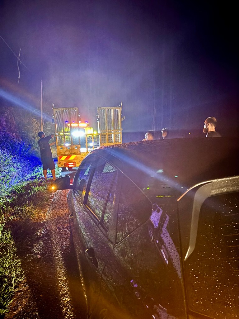 Es ist klar, wir brauchen Hilfe. Im strömenden Regen versuchen wir, andere Autos anzuhalten, wenn denn welche vorbeikommen. Irgendwann hält ein Auto mit drei jungen Männern, von denen niemand Englisch spricht. Irgendwie können wir erklären was los ist, die platten Reifen erklären sich auch von selbst. Die drei haben einen Freund mit Abschlepper, den sie für uns anrufen. Mit Zweigen aus dem angrenzenden Dschungel haben die Männer die beiden Autos und die Gefahrenstelle gesichert.